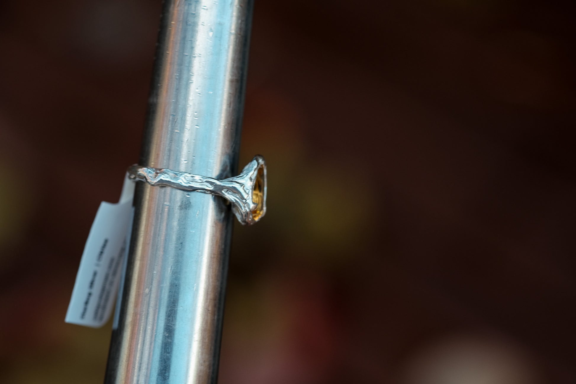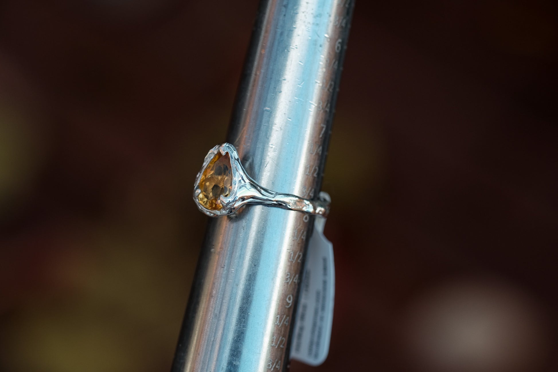 A fluid sterling silver setting holds aloft a perfect pear shaped faceted citrine... you must see this one to appreciate it!