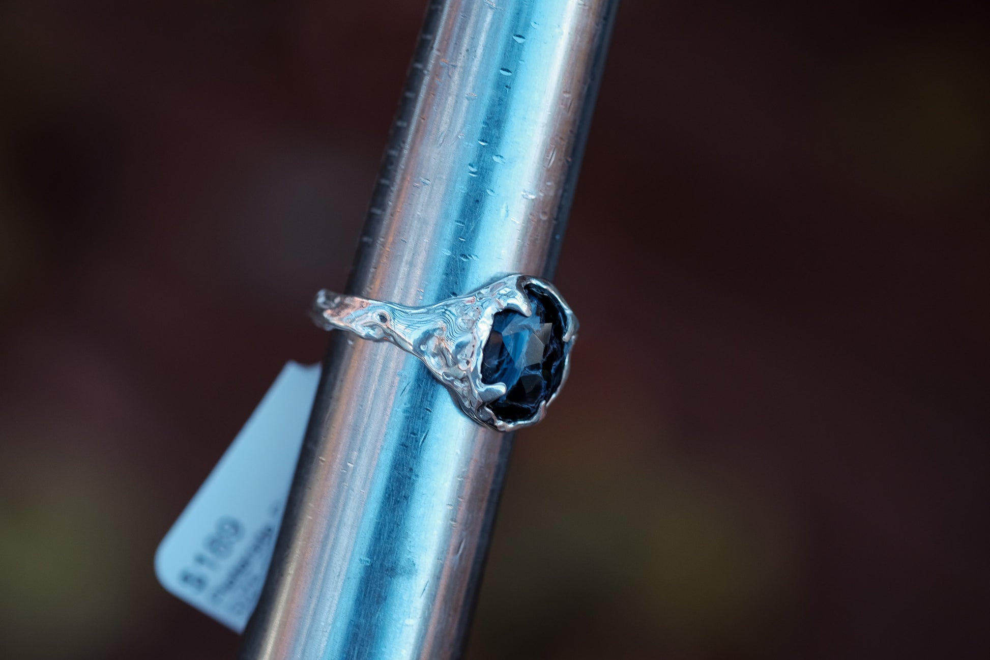 Rose Cut Pietersite... swirling blues and blacks shimmering like a relic from a fantasy novel. Hugged by a flowing sterling silver setting, four claws.
